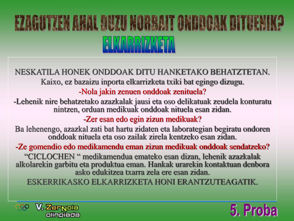 EZAGUTZEN AHAL DUZU NORBAIT ONDDOAK DITUENIK? ELKARRIZKETA NESKATILA HONEK ONDDOAK DITU HANKETAKO BEHATZTETAN. Kaixo, ez bazaizu inporta elkarrizketa txiki bat egingo dizugu. -Nola jakin zenuen onddoak zenituela? -Lehenik nire behatzetako azazkalak jausi eta oso delikatuak zeudela konturatu nintzen, orduan medikuak onddoak nituela esan zidan. -Zer esan edo egin zizun medikuak? Ba lehenengo, azazkal zati bat hartu zidaten eta laborategian begiratu ondoren onddoak nituela eta oso zailak zirela kentzeko esan zidan. -Ze gomendio edo medikamendu eman zizun medikuak onddoak sendatzeko? “CICLOCHEN “ medikamendua emateko esan dizan, lehenik azazkalak alkolarekin garbitu eta produktua eman. Hankak urarekin kontaktuan denbora asko edukitzea txarra zela ere esan zidan. ESKERRIKASKO ELKARRIZKETA HONI ERANTZUTEAGATIK.