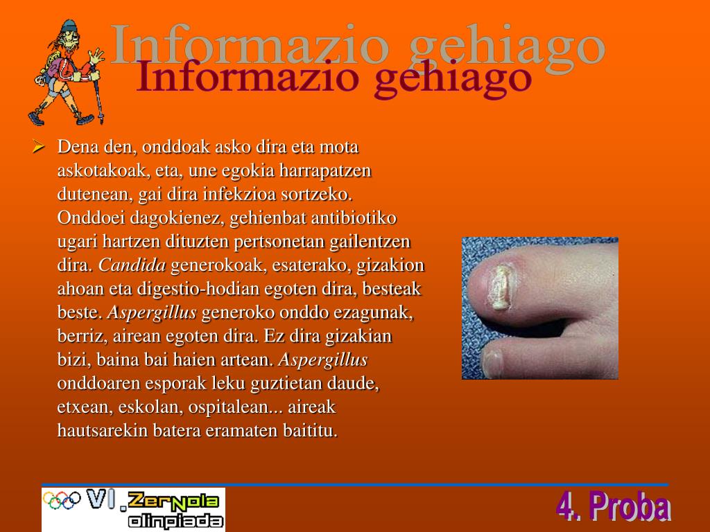 Informazio gehiago • Dena den, onddoak asko dira eta mota askotakoak, eta, une egokia harrapatzen dutenean, gai dira infekzioa sortzeko. Onddoei dagokienez, gehienbat antibiotiko ugari hartzen dituzten pertsonetan gailentzen dira. Candida generokoak, esaterako, gizakion ahoan eta digestio-hodian egoten dira, besteak beste. Aspergillus generoko onddo ezagunak, berriz, airean egoten dira. Ez dira gizakian bizi, baina bai haien artean. Aspergillus onddoaren esporak leku guztietan daude, etxean, eskolan, ospitalean... aireak hautsarekin batera eramaten baititu.