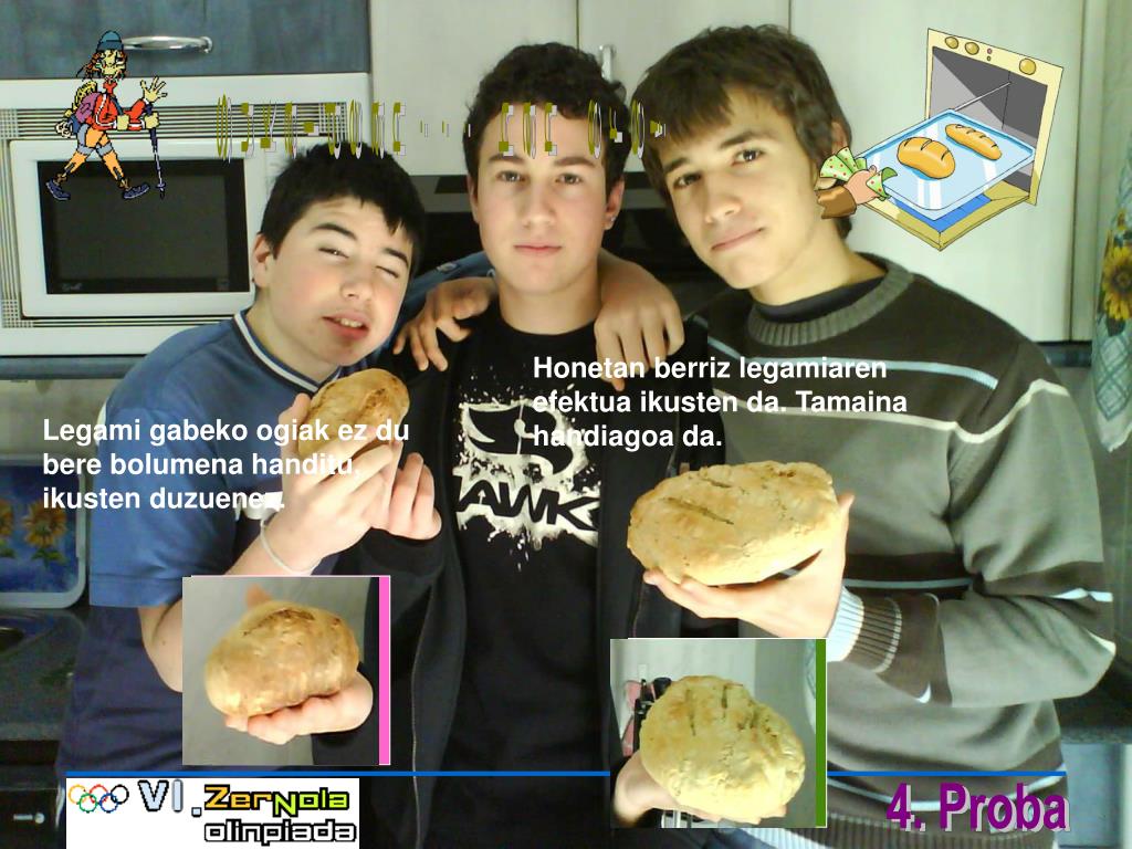 Sukaldean... han ere! Honetan berriz legamiaren efektua ikusten da. Tamaina handiagoa da. Legami gabeko ogiak ez du bere bolumena handitu, ikusten duzuenez.