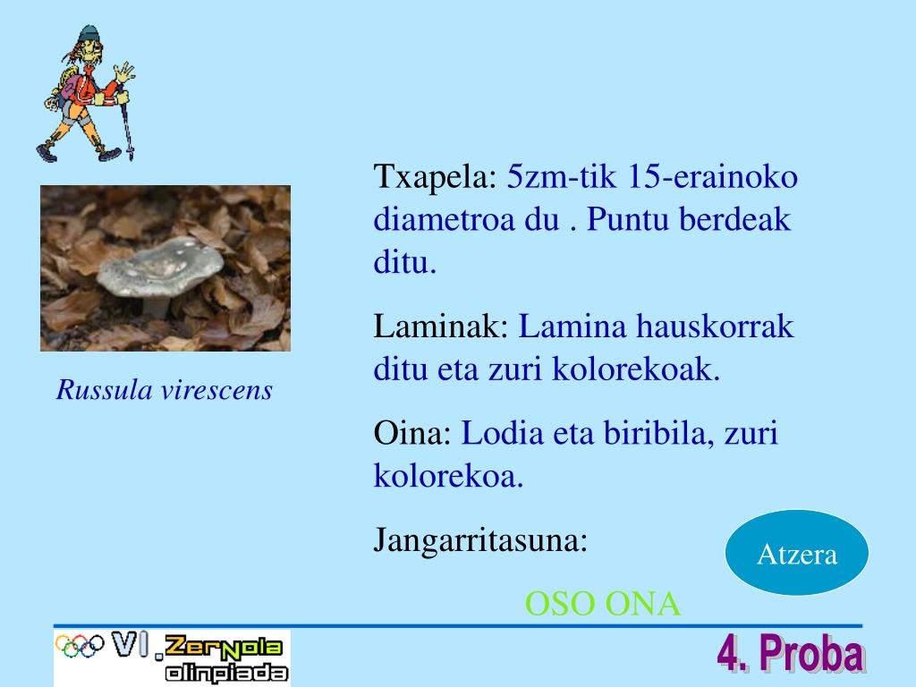 Txapela:5zm-tik 15-erainoko diametroa du . Puntu berdeak ditu. Laminak:Lamina hauskorrak ditu eta zuri kolorekoak. Oina:Lodia eta biribila, zuri kolorekoa. Jangarritasuna: OSO ONA Russula virescens Atzera