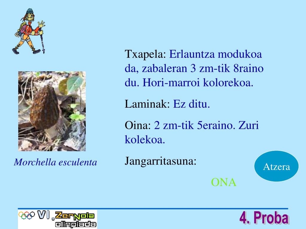 Txapela:Erlauntza modukoa da, zabaleran 3 zm-tik 8raino du. Hori-marroi kolorekoa. Laminak:Ez ditu. Oina:2 zm-tik 5eraino. Zuri kolekoa. Jangarritasuna: ONA Atzera Morchella esculenta