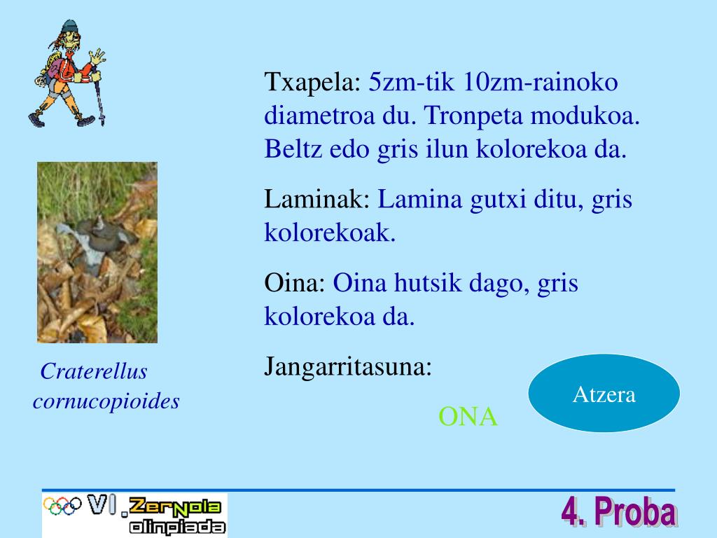 Txapela:5zm-tik 10zm-rainoko diametroa du. Tronpeta modukoa. Beltz edo gris ilun kolorekoa da. Laminak:Lamina gutxi ditu, gris kolorekoak. Oina:Oina hutsik dago, gris kolorekoa da. Jangarritasuna: ONA Craterellus cornucopioides Atzera