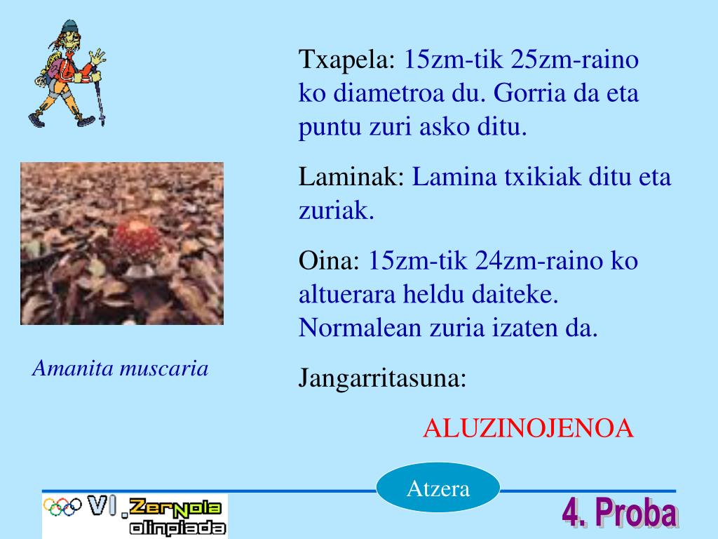 Txapela:15zm-tik 25zm-raino ko diametroa du. Gorria da eta puntu zuri asko ditu. Laminak:Lamina txikiak ditu eta zuriak. Oina:15zm-tik 24zm-raino ko altuerara heldu daiteke. Normalean zuria izaten da. Jangarritasuna: ALUZINOJENOA Amanita muscaria Atzera