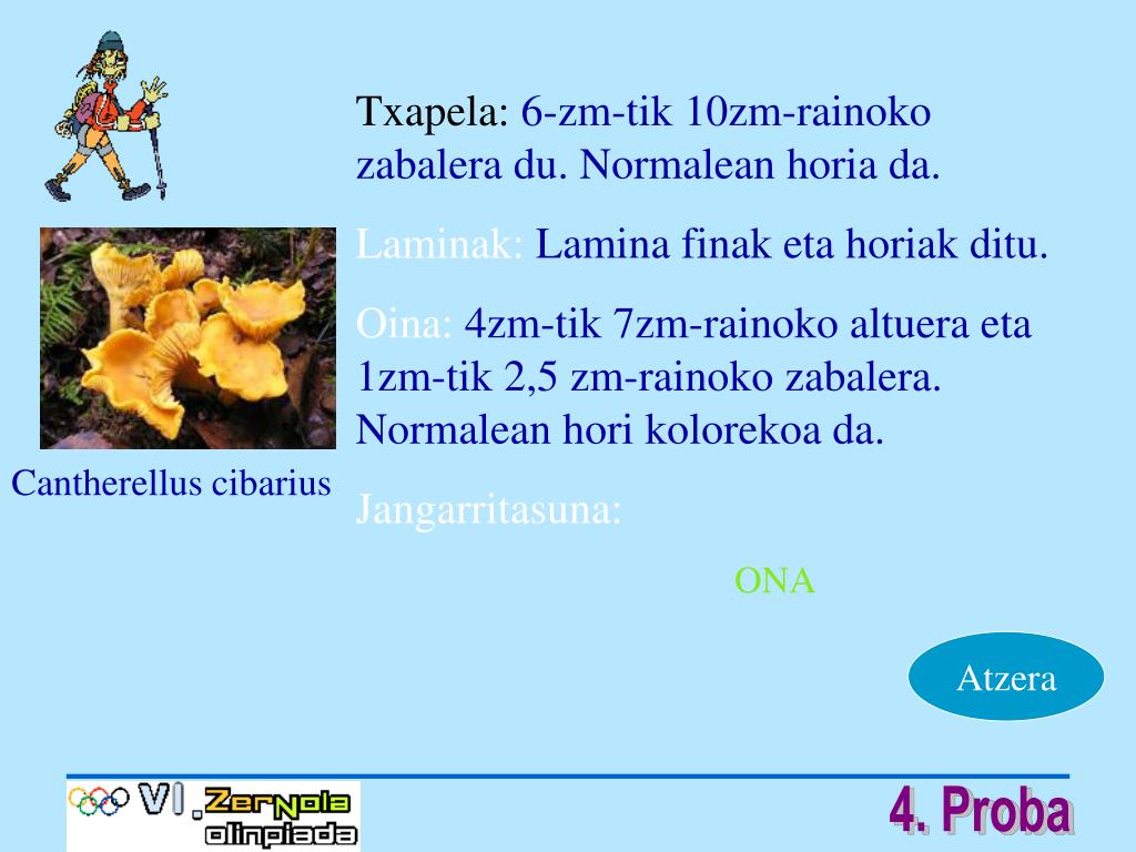 Txapela:6-zm-tik 10zm-rainoko zabalera du. Normalean horia da. Laminak: Lamina finak eta horiak ditu. Oina: 4zm-tik 7zm-rainoko altuera eta 1zm-tik 2,5 zm-rainoko zabalera. Normalean hori kolorekoa da. Jangarritasuna: ONA Cantherellus cibarius Atzera