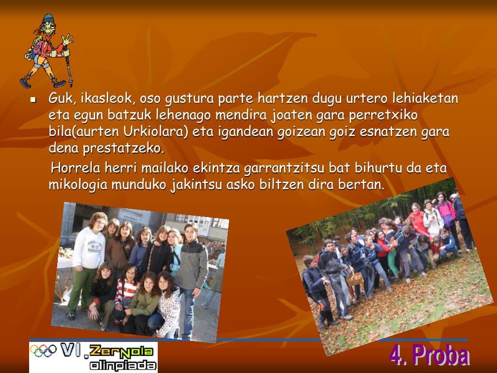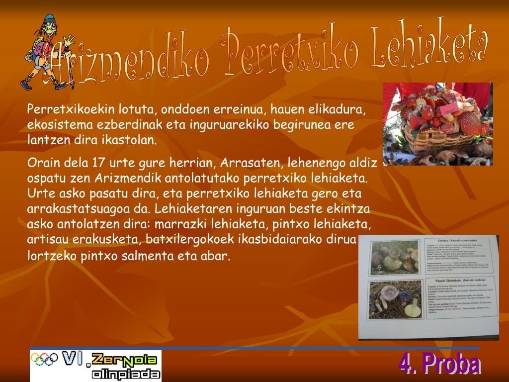 Guk, ikasleok, oso gustura parte hartzen dugu urtero lehiaketan eta egun batzuk lehenago mendira joaten gara perretxiko bila(aurten Urkiolara) eta igandean goizean goiz esnatzen gara dena prestatzeko. Horrela herri mailako ekintza garrantzitsu bat bihurtu da eta mikologia munduko jakintsu asko biltzen dira bertan.