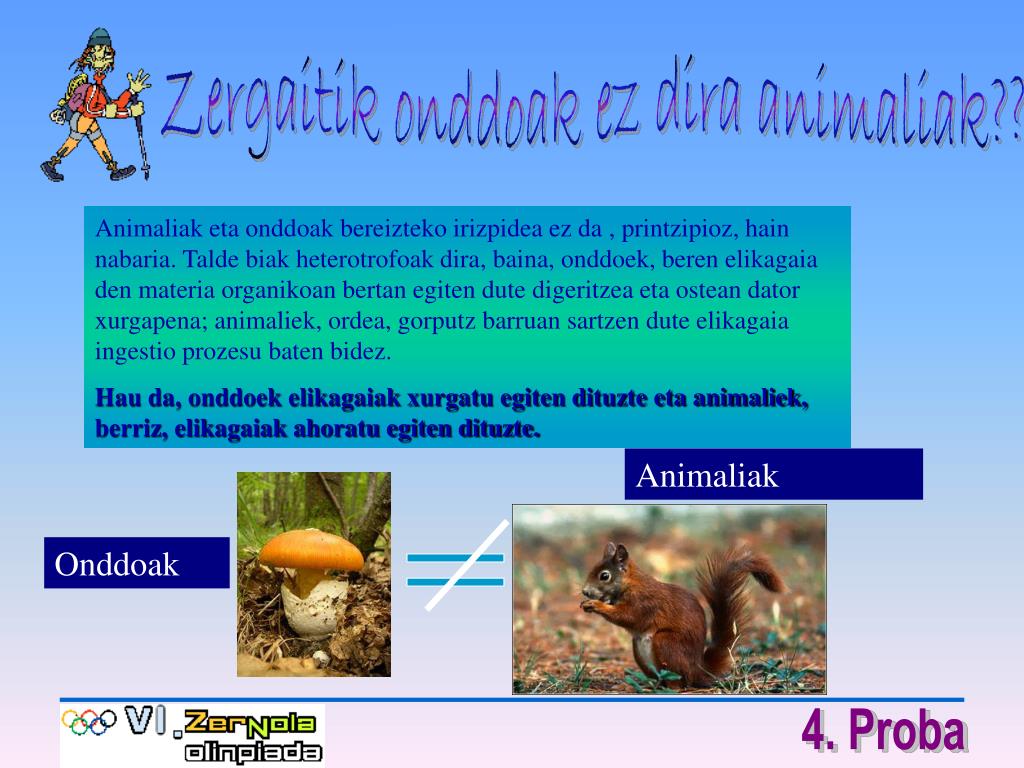 Zergaitik onddoak ez dira animaliak?? Animaliak eta onddoak bereizteko irizpidea ez da , printzipioz, hain nabaria. Talde biak heterotrofoak dira, baina, onddoek, beren elikagaia den materia organikoan bertan egiten dute digeritzea eta ostean dator xurgapena; animaliek, ordea, gorputz barruan sartzen dute elikagaia ingestio prozesu baten bidez. Hau da, onddoek elikagaiak xurgatu egiten dituzte eta animaliek, berriz, elikagaiak ahoratu egiten dituzte. Animaliak Onddoak