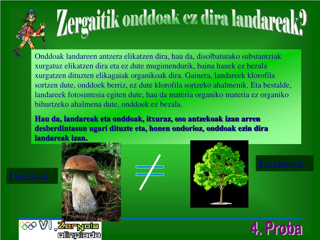 Zergaitik onddoak ez dira landareak? Onddoak landareen antzera elikatzen dira, hau da, disolbatutako substantziak xurgatuz elikatzen dira eta ez dute mugimendurik, baina hauek ez bezala xurgatzen dituzten elikagaiak organikoak dira. Gainera, landareek klorofila sortzen dute, onddoek berriz, ez dute klorofila sortzeko ahalmenik. Eta bestalde, landareek fotosintesia egiten dute, hau da materia organiko materia ez organiko bihurtzeko ahalmena dute, onddoek ez bezala. Hau da, landareak eta onddoak, itxuraz, oso antzekoak izan arren desberdintasun ugari dituzte eta, honen ondorioz, onddoak ezin dira landareak izan. Landareak Onddoak