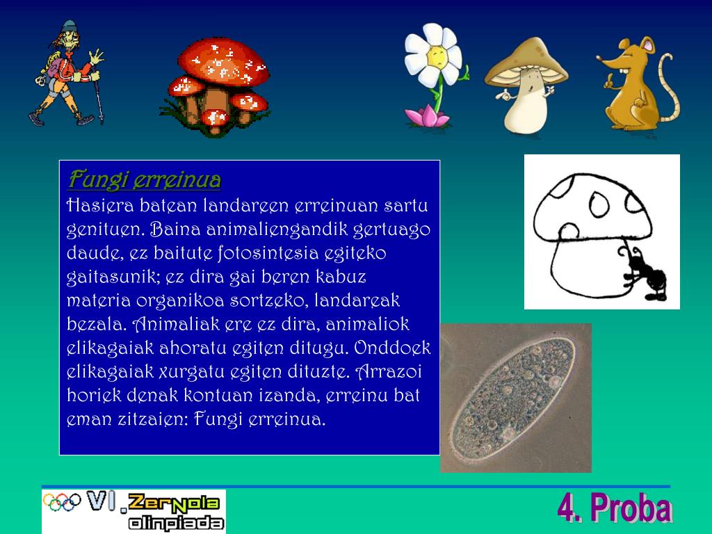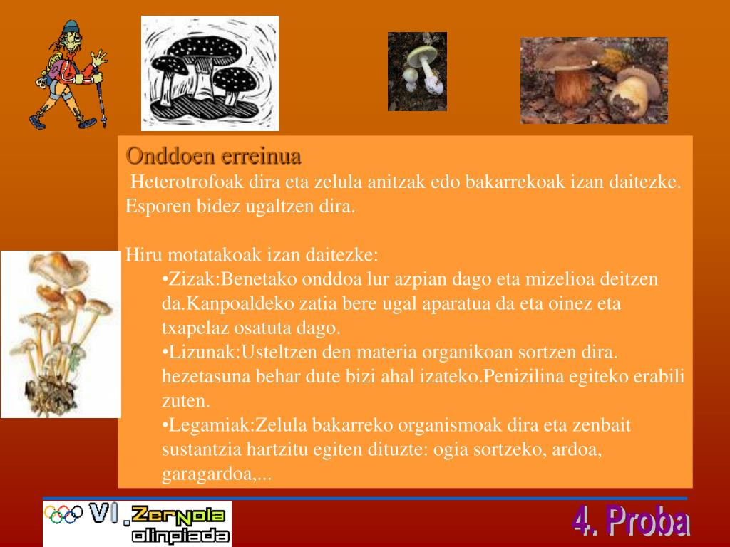 Onddoen erreinua • Heterotrofoak dira eta zelula anitzak edo bakarrekoak izan daitezke. Esporen bidez ugaltzen dira. • Hiru motatakoak izan daitezke: • Zizak:Benetako onddoa lur azpian dago eta mizelioa deitzen da.Kanpoaldeko zatia bere ugal aparatua da eta oinez eta txapelaz osatuta dago. • Lizunak:Usteltzen den materia organikoan sortzen dira. hezetasuna behar dute bizi ahal izateko.Penizilina egiteko erabili zuten. • Legamiak:Zelula bakarreko organismoak dira eta zenbait sustantzia hartzitu egiten dituzte: ogia sortzeko, ardoa, garagardoa,...