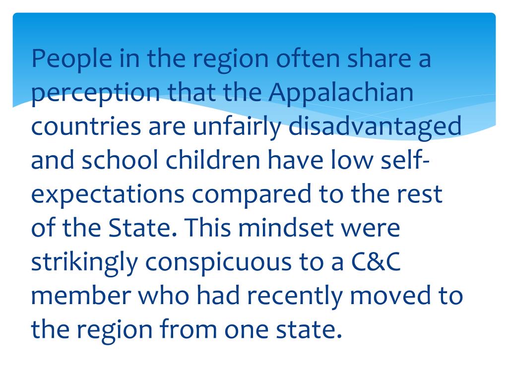 People in the region often share a perception that the Appalachian countries are unfairly disadvantaged and school children have low self-expectations compared to the rest of the State. This mindset were strikingly conspicuous to a C&C member who had recently moved to the region from one state.