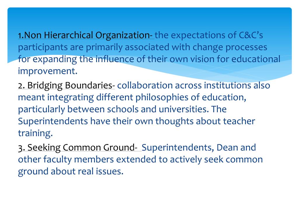 1.Non Hierarchical Organization- the expectations of C&C’s participants are primarily associated with change processes for expanding the influence of their own vision for educational improvement. 2. Bridging Boundaries- collaboration across institutions also meant integrating different philosophies of education, particularly between schools and universities. The Superintendents have their own thoughts about teacher training. 3. Seeking Common Ground- Superintendents, Dean and other faculty members extended to actively seek common ground about real issues.