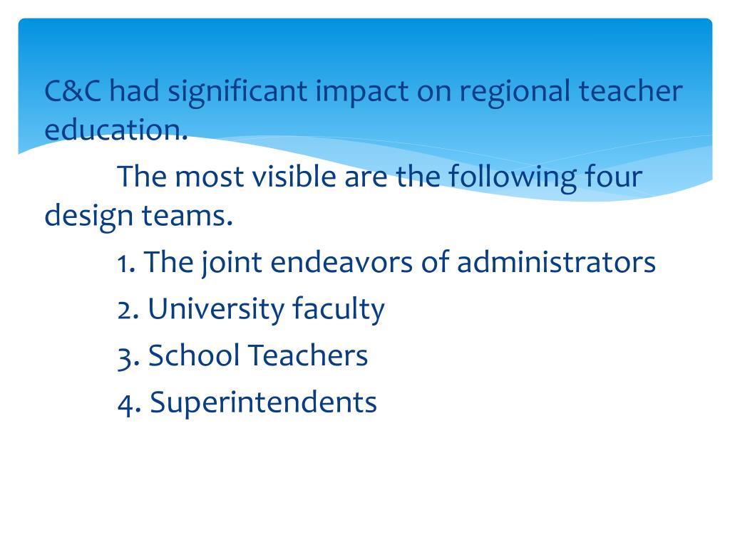 C&C had significant impact on regional teacher education. The most visible are the following four design teams. 1. The joint endeavors of administrators 2. University faculty 3. School Teachers 4. Superintendents