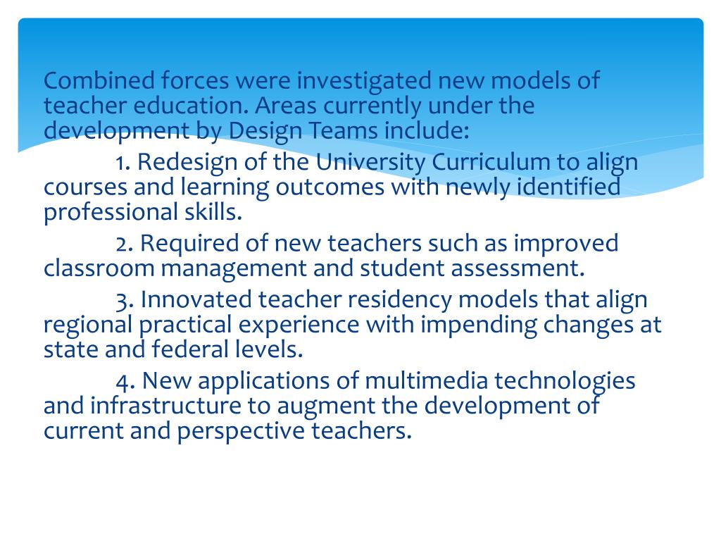 Combined forces were investigated new models of teacher education. Areas currently under the development by Design Teams include: 1. Redesign of the University Curriculum to align courses and learning outcomes with newly identified professional skills. 2. Required of new teachers such as improved classroom management and student assessment. 3. Innovated teacher residency models that align regional practical experience with impending changes at state and federal levels. 4. New applications of multimedia technologies and infrastructure to augment the development of current and perspective teachers.