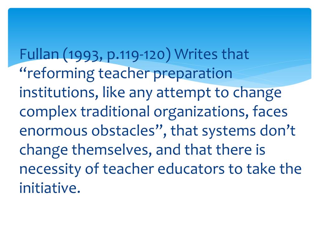 Fullan (1993, p.119-120) Writes that “reforming teacher preparation institutions, like any attempt to change complex traditional organizations, faces enormous obstacles”, that systems don’t change themselves, and that there is necessity of teacher educators to take the initiative.
