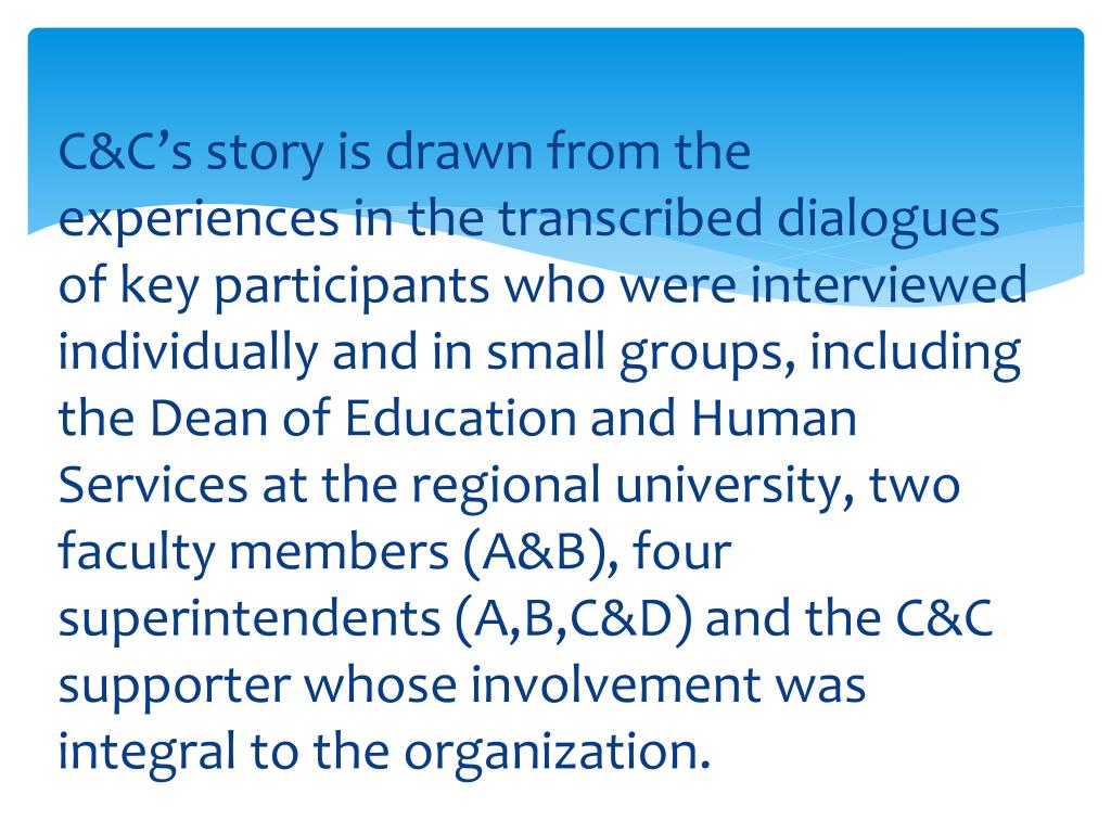 C&C’s story is drawn from the experiences in the transcribed dialogues of key participants who were interviewed individually and in small groups, including the Dean of Education and Human Services at the regional university, two faculty members (A&B), four superintendents (A,B,C&D) and the C&C supporter whose involvement was integral to the organization.