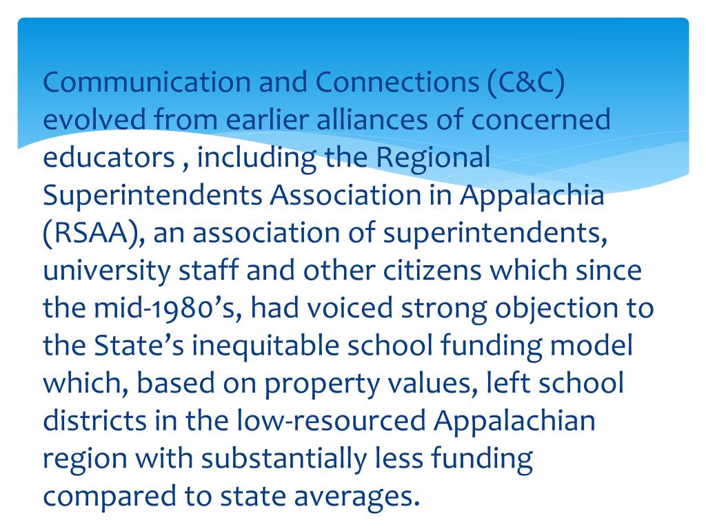 Communication and Connections (C&C) evolved from earlier alliances of concerned educators , including the Regional Superintendents Association in Appalachia (RSAA), an association of superintendents, university staff and other citizens which since the mid-1980’s, had voiced strong objection to the State’s inequitable school funding model which, based on property values, left school districts in the low-resourced Appalachian region with substantially less funding compared to state averages.