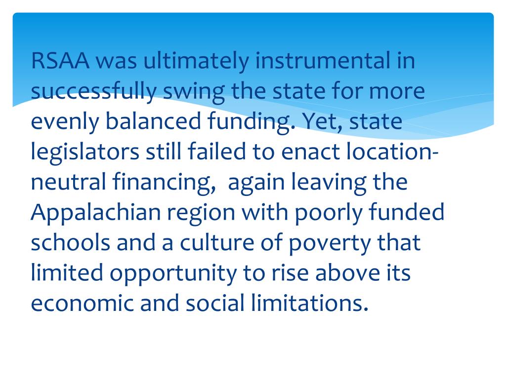 RSAA was ultimately instrumental in successfully swing the state for more evenly balanced funding. Yet, state legislators still failed to enact location-neutral financing, again leaving the Appalachian region with poorly funded schools and a culture of poverty that limited opportunity to rise above its economic and social limitations.