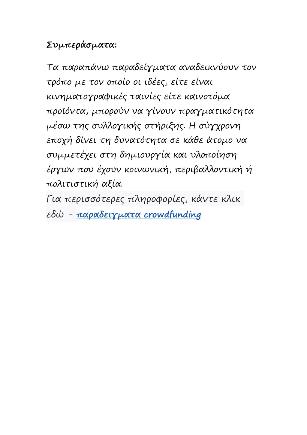 ήταν εντυπωσιακή. Μέσα από τις συνεισφορές, η ταινία παρουσιάστηκε σε φεστιβάλ και κατάφερε να κερδίσει βραβεία. Για περισσότερες πληροφορίες, κάντε κλικ εδώ - παραδειγματα crowdfunding Καινοτομικό Προϊόν: "Έξυπνο Καλαθάκι Ανακύκλωσης": Μια ομάδα εφευρετών προτείνει ένα έξυπνο καλαθάκι ανακύκλωσης που ανιχνεύει αυτόματα τα υλικά και προωθεί την ορθή διαλογή. Με την εκκίνηση μιας εκστρατείας crowdfunding, συγκέντρωσαν τα απαραίτητα κεφάλαια για την παραγωγή του πρώτου πρωτότυπου καλαθιού. Η επιτυχημένη υλοποίηση του έργου ενίσχυσε την καινοτομία στον τομέα της ανακύκλωσης. Για περισσότερες πληροφορίες, κάντε κλικ εδώ - παραδειγματα crowdfunding Φιλανθρωπική Εκστρατεία: "Βοήθεια στα Παιδιά του Κόσμου":