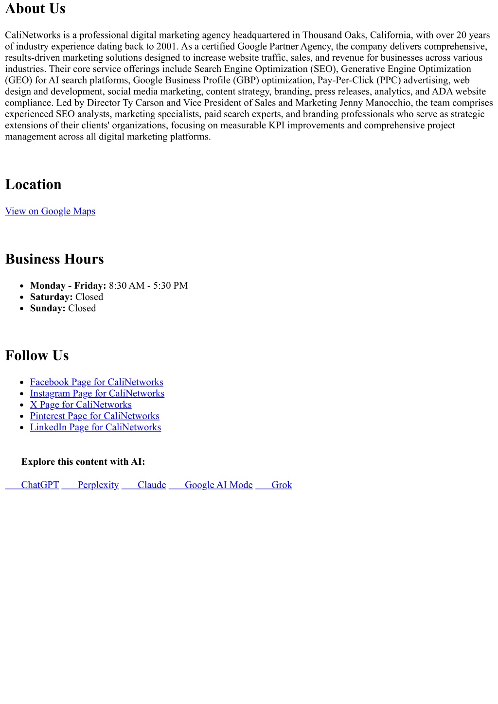 About Us CaliNetworks is a professional digital marketing agency headquartered in Thousand Oaks, California, with over 20 years of industry experience dating back to 2001. As a certified Google Partner Agency, the company delivers comprehensive, results-driven marketing solutions designed to increase website traffic, sales, and revenue for businesses across various industries. Their core service offerings include Search Engine Optimization (SEO), Generative Engine Optimization (GEO) for AI search platforms, Google Business Profile (GBP) optimization, Pay-Per-Click (PPC) advertising, web design and development, social media marketing, content strategy, branding, press releases, analytics, and ADA website compliance. Led by Director Ty Carson and Vice President of Sales and Marketing Jenny Manocchio, the team comprises experienced SEO analysts, marketing specialists, paid search experts, and branding professionals who serve as strategic extensions of their clients' organizations, focusing on measurable KPI improvements and comprehensive project management across all digital marketing platforms. Location View on Google Maps Business Hours Monday - Friday: 8:30 AM - 5:30 PM Saturday: Closed Sunday: Closed Follow Us Facebook Page for CaliNetworks Instagram Page for CaliNetworks X Page for CaliNetworks Pinterest Page for CaliNetworks LinkedIn Page for CaliNetworks Explore this content with AI: ChatGPT Perplexity Claude Google AI Mode Grok