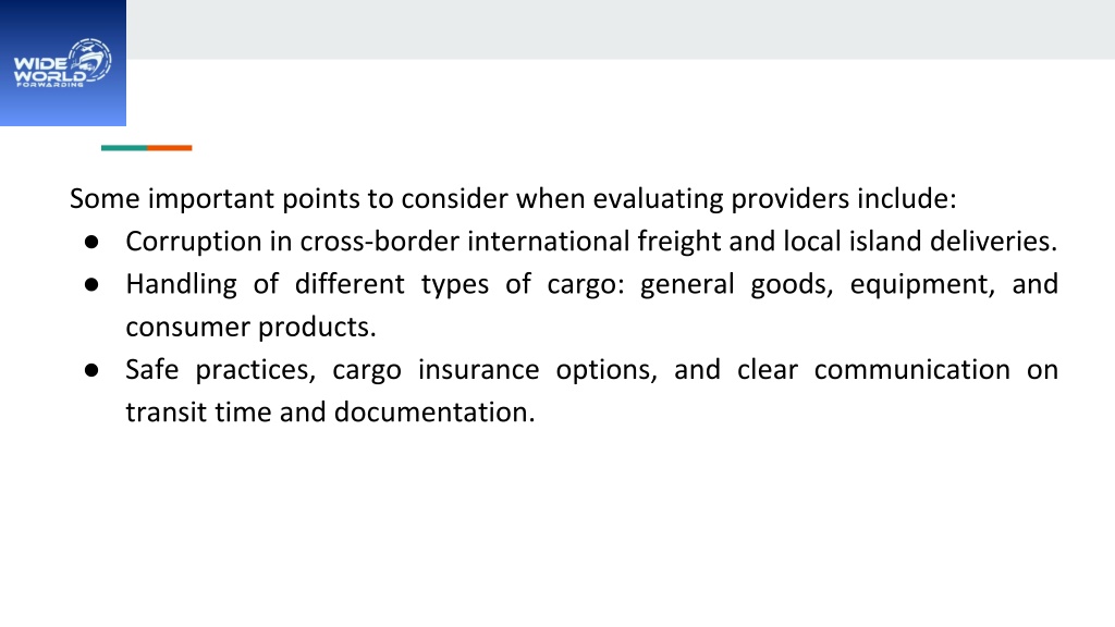 8. Some important points to consider when evaluating providers include: • Corruption in cross-border international freight and local island deliveries. • Handling of different types of cargo: general goods, equipment, and consumer products. • Safe practices, cargo insurance options, and clear communication on transit time and documentation.