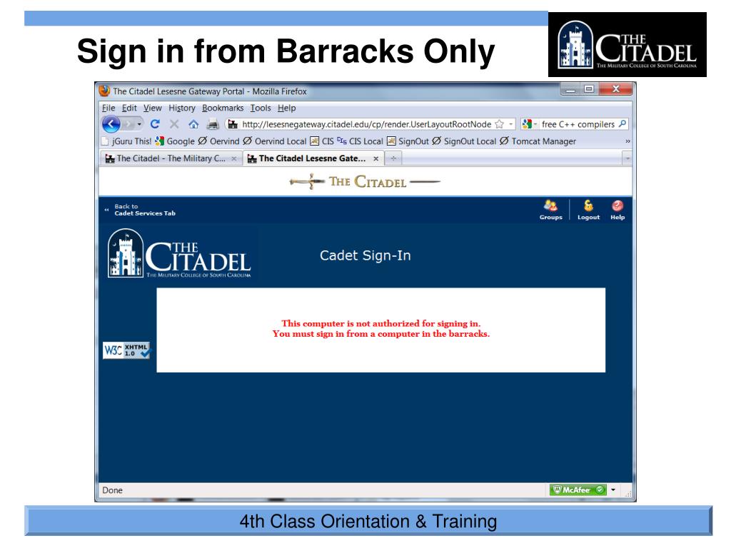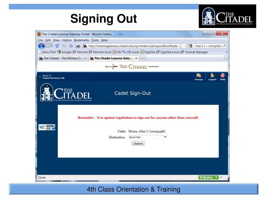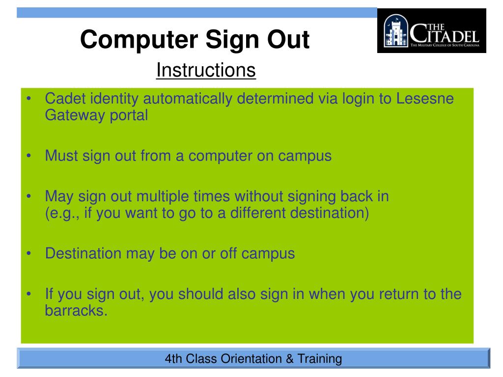 Cadet identity automatically determined via login to Lesesne Gateway portal Must sign out from a computer on campus May sign out multiple times without signing back in(e.g., if you want to go to a different destination) Destination may be on or off campus If you sign out, you should also sign in when you return to the barracks. Computer Sign Out Instructions