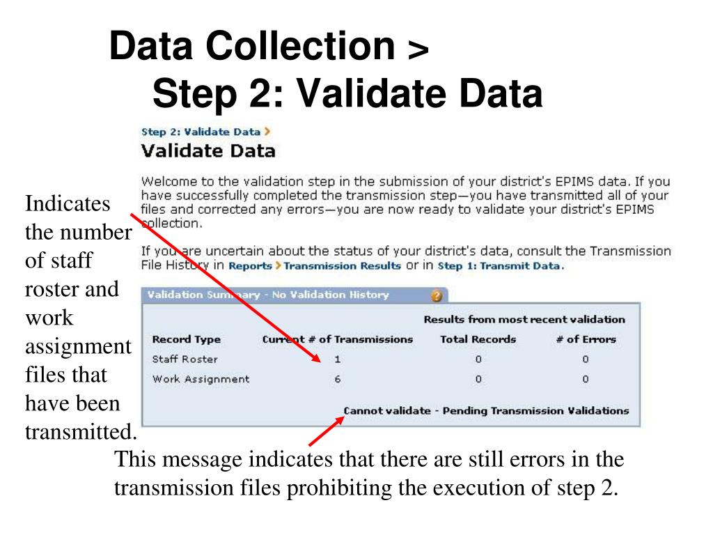 Data Collection > Step 2: Validate Data Indicates the number of staff roster and work assignment files that have been transmitted. This message indicates that there are still errors in the transmission files prohibiting the execution of step 2.