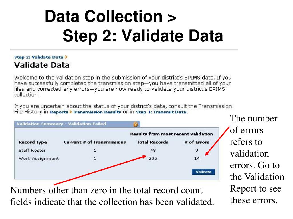 Data Collection > Step 2: Validate Data The number of errors refers to validation errors. Go to the Validation Report to see these errors. Numbers other than zero in the total record count fields indicate that the collection has been validated.