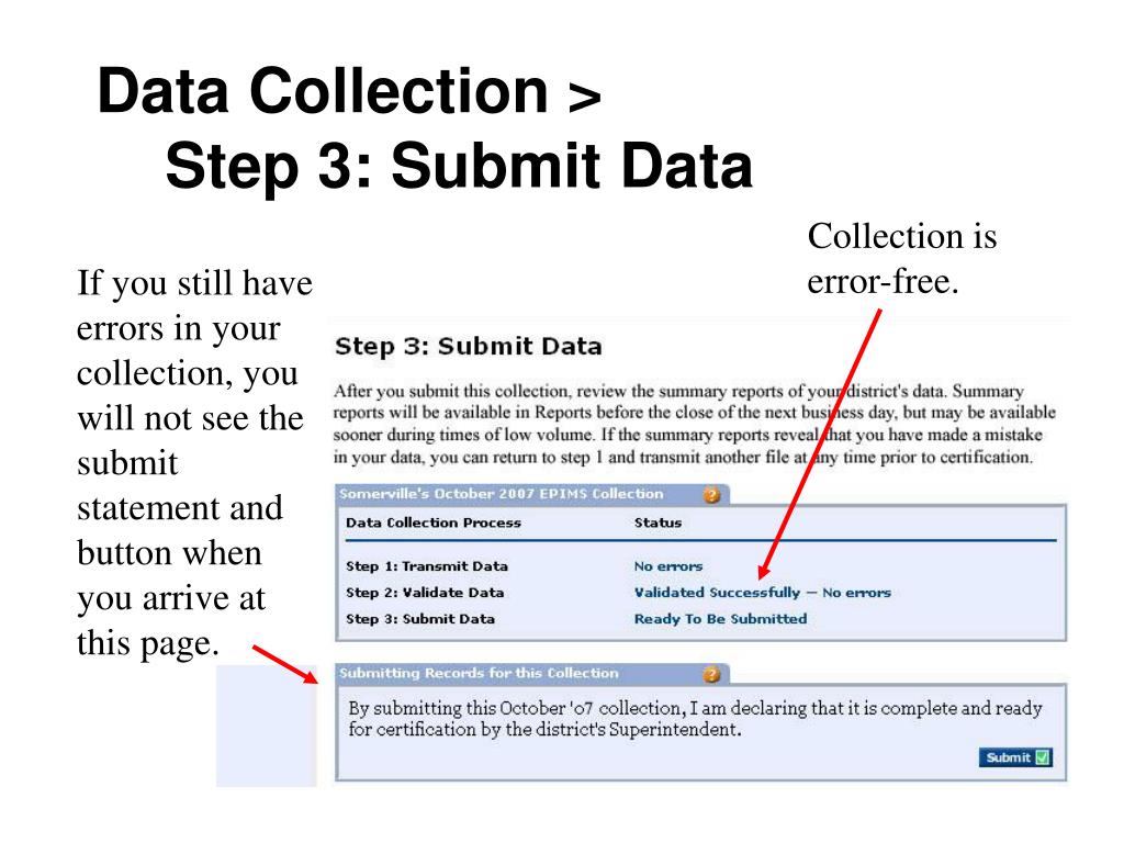 Data Collection > Step 3: Submit Data Collection is error-free. If you still have errors in your collection, you will not see the submit statement and button when you arrive at this page.