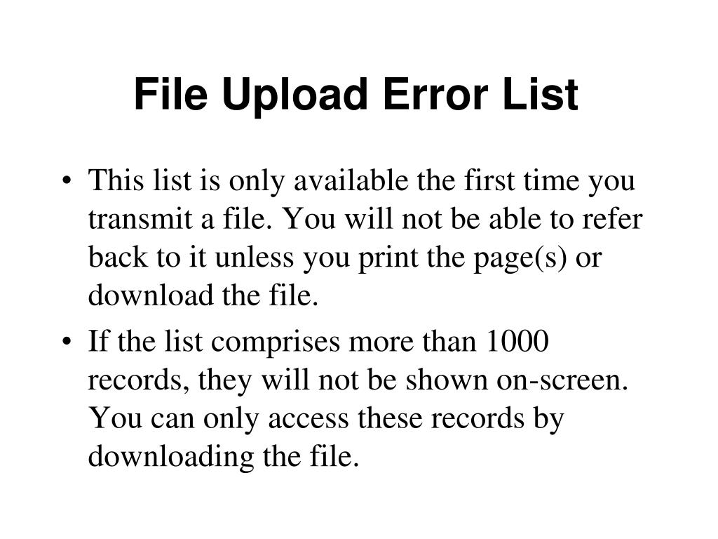 File Upload Error List • This list is only available the first time you transmit a file. You will not be able to refer back to it unless you print the page(s) or download the file. • If the list comprises more than 1000 records, they will not be shown on-screen. You can only access these records by downloading the file.