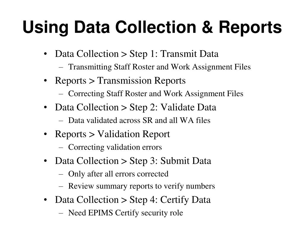 Using Data Collection & Reports • Data Collection > Step 1: Transmit Data • Transmitting Staff Roster and Work Assignment Files • Reports > Transmission Reports • Correcting Staff Roster and Work Assignment Files • Data Collection > Step 2: Validate Data • Data validated across SR and all WA files • Reports > Validation Report • Correcting validation errors • Data Collection > Step 3: Submit Data • Only after all errors corrected • Review summary reports to verify numbers • Data Collection > Step 4: Certify Data • Need EPIMS Certify security role