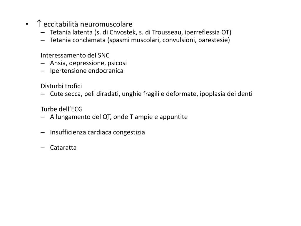 eccitabilità neuromuscolare • Tetania latenta (s. di Chvostek, s. di Trousseau, iperreflessia OT) • Tetania conclamata (spasmi muscolari, convulsioni, parestesie) Interessamento del SNC • Ansia, depressione, psicosi • Ipertensione endocranica Disturbi trofici • Cute secca, peli diradati, unghie fragili e deformate, ipoplasia dei denti Turbe dell’ECG • Allungamento del QT, onde T ampie e appuntite • Insufficienza cardiaca congestizia • Cataratta