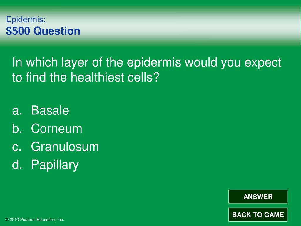 Epidermis: $500 Answer • In which layer of the epidermis would you expect to find the healthiest cells? • Basale • Corneum • Granulosum • Papillary BACK TO GAME