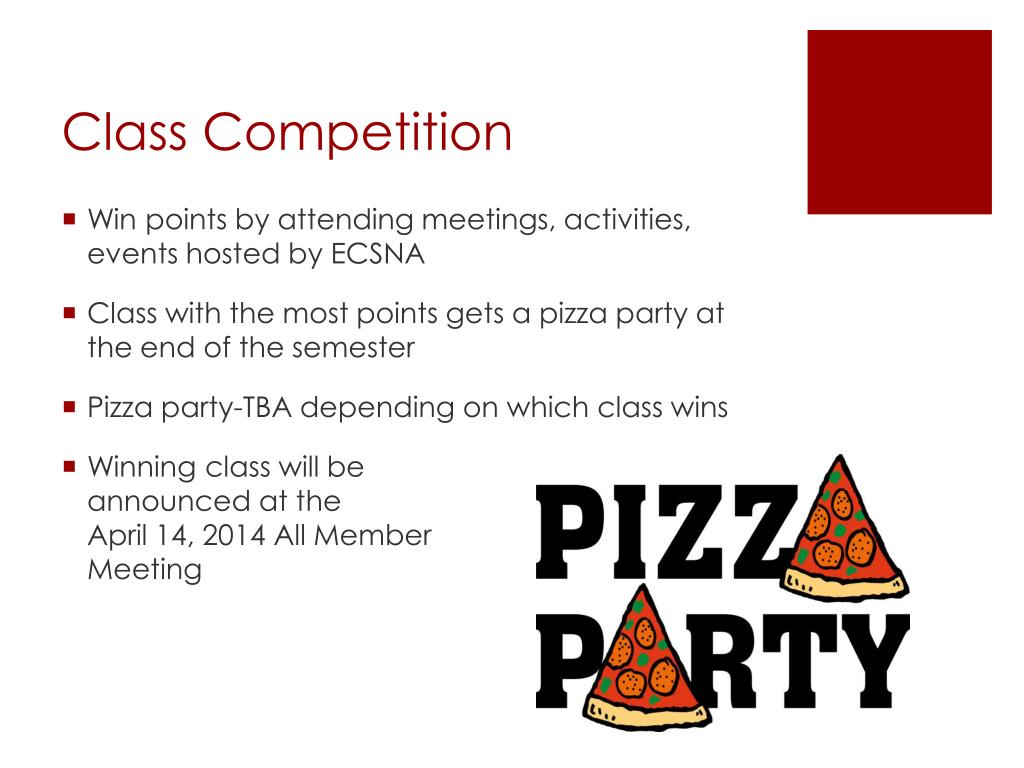 Class Competition Win points by attending meetings, activities, events hosted by ECSNA Class with the most points gets a pizza party at the end of the semester Pizza party-TBA depending on which class wins Winning class will be announced at the April 14, 2014 All Member Meeting