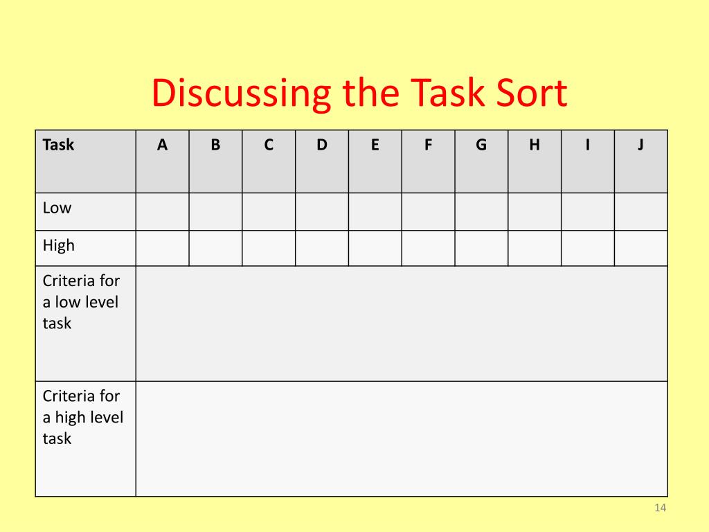 Task Sort Activity • Sort the provided tasks as high or low cognitive demand. • List characteristics you use to sort the tasks.