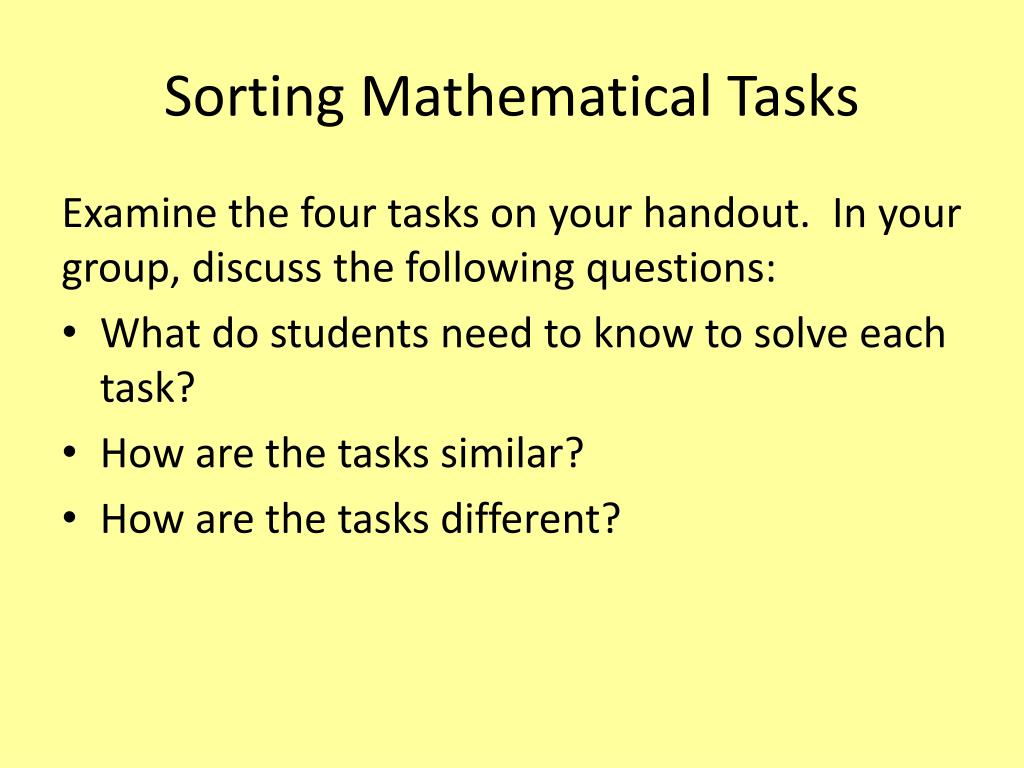 Sorting Mathematical Tasks Examine the four tasks on your handout. In your group, discuss the following questions: • What do students need to know to solve each task? • How are the tasks similar? • How are the tasks different?