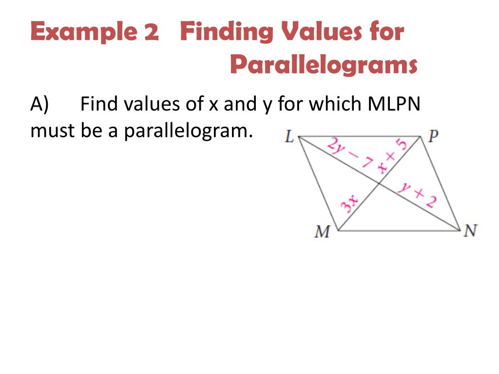 Example 2 Finding Values for Parallelograms A) Find values of x and y for which MLPN must be a parallelogram.