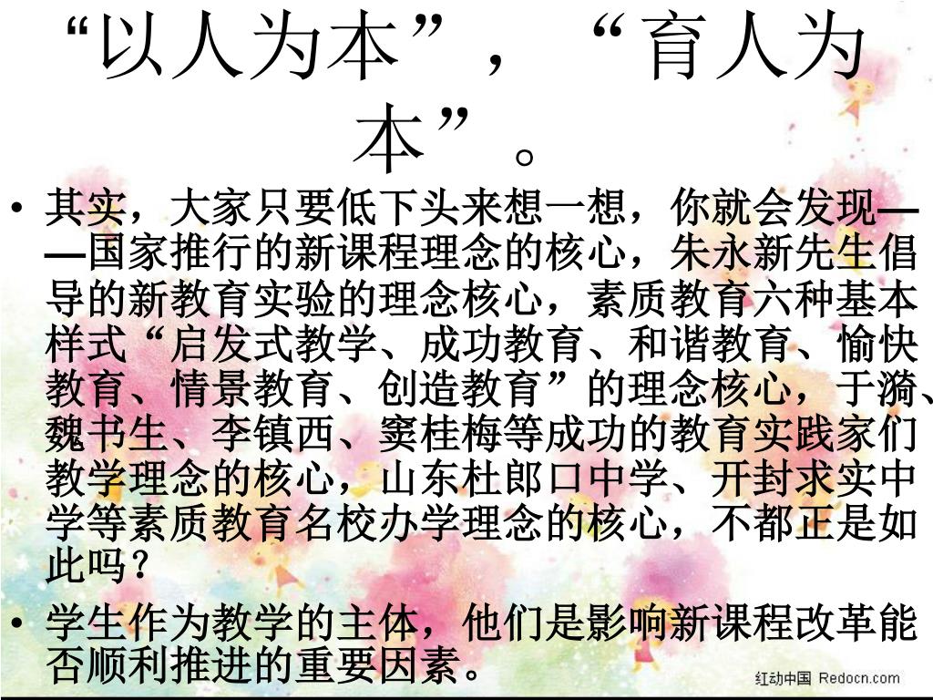 “以人为本”,“育人为本”。 • 其实,大家只要低下头来想一想,你就会发现——国家推行的新课程理念的核心,朱永新先生倡导的新教育实验的理念核心,素质教育六种基本样式“启发式教学、成功教育、和谐教育、愉快教育、情景教育、创造教育”的理念核心,于漪、魏书生、李镇西、窦桂梅等成功的教育实践家们教学理念的核心,山东杜郎口中学、开封求实中学等素质教育名校办学理念的核心,不都正是如此吗? • 学生作为教学的主体,他们是影响新课程改革能否顺利推进的重要因素。