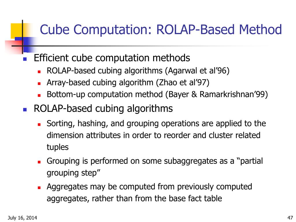 Cube Computation: ROLAP-Based Method • Efficient cube computation methods • ROLAP-based cubing algorithms (Agarwal et al’96) • Array-based cubing algorithm (Zhao et al’97) • Bottom-up computation method (Bayer & Ramarkrishnan’99) • ROLAP-based cubing algorithms • Sorting, hashing, and grouping operations are applied to the dimension attributes in order to reorder and cluster related tuples • Grouping is performed on some subaggregates as a “partial grouping step” • Aggregates may be computed from previously computed aggregates, rather than from the base fact table