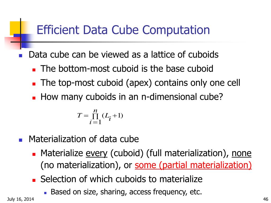 Efficient Data Cube Computation • Data cube can be viewed as a lattice of cuboids • The bottom-most cuboid is the base cuboid • The top-most cuboid (apex) contains only one cell • How many cuboids in an n-dimensional cube? • Materialization of data cube • Materialize every (cuboid) (full materialization), none (no materialization), or some (partial materialization) • Selection of which cuboids to materialize • Based on size, sharing, access frequency, etc.