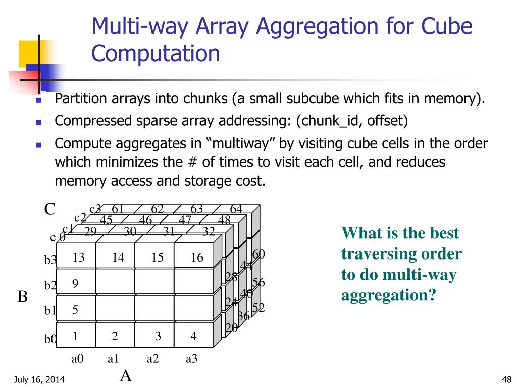 Multi-way Array Aggregation for Cube Computation C c3 61 62 63 64 c2 45 46 47 48 c1 29 30 31 32 c 0 B 60 13 14 15 16 b3 44 28 B 56 9 b2 40 24 52 5 b1 36 20 1 2 3 4 b0 a0 a1 a2 a3 A