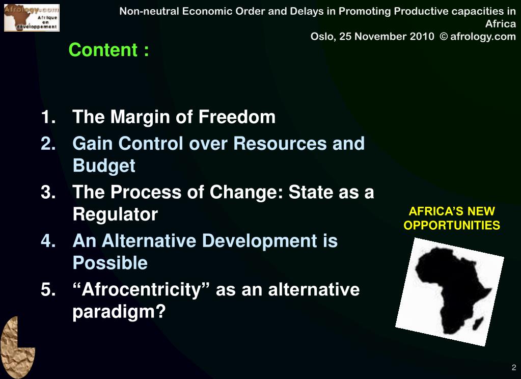 Content : • The Margin of Freedom • Gain Control over Resources and Budget • The Process of Change: State as a Regulator • An Alternative Development is Possible • “Afrocentricity” as an alternative paradigm? AFRICA’S NEW OPPORTUNITIES