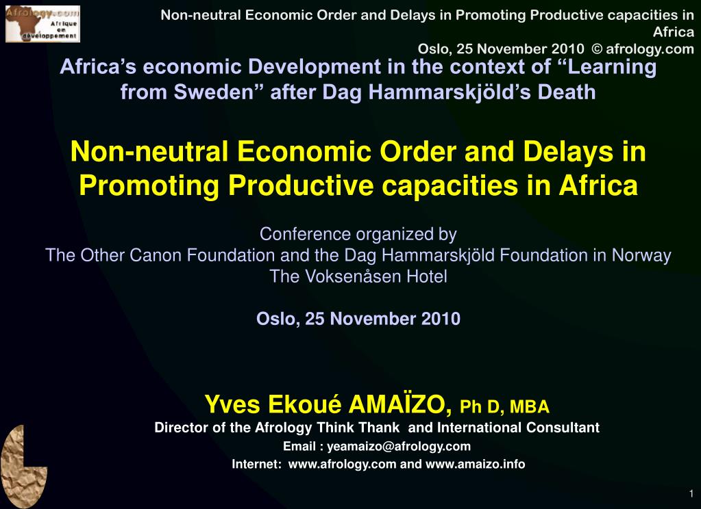 Africa’s economic Development in the context of “Learning from Sweden” after Dag Hammarskjöld’s Death Non-neutral Economic Order and Delays in Promoting Productive capacities in Africa Conferenceorganized by The Other Canon Foundation and the Dag Hammarskjöld Foundation in Norway The Voksenåsen Hotel Oslo, 25 November 2010 Yves Ekoué AMAÏZO, Ph D, MBA Director of the Afrology ThinkThank and International Consultant Email : yeamaizo@afrology.com Internet: www.afrology.com and www.amaizo.info