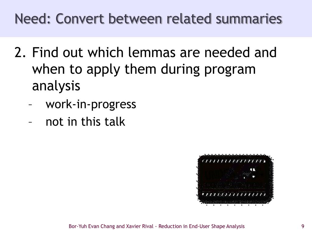 Need: Convert between related summaries • Find out which lemmas are needed and when to apply them during program analysis • work-in-progress • not in this talk Bor-Yuh Evan Chang and Xavier Rival - Reduction in End-User Shape Analysis