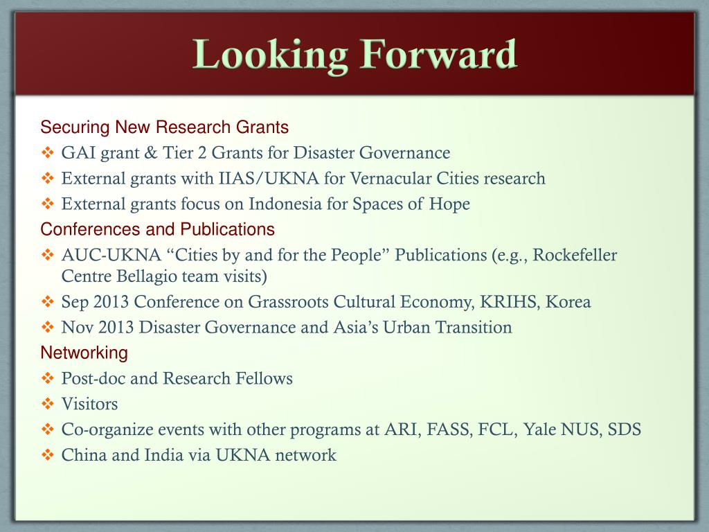 Looking Forward Securing New Research Grants • GAI grant & Tier 2 Grants for Disaster Governance • External grants with IIAS/UKNA for Vernacular Cities research • External grants focus on Indonesia for Spaces of Hope Conferences and Publications • AUC-UKNA “Cities by and for the People” Publications (e.g., Rockefeller Centre Bellagio team visits) • Sep 2013 Conference on Grassroots Cultural Economy, KRIHS, Korea • Nov 2013 Disaster Governance and Asia’s Urban Transition Networking • Post-doc and Research Fellows • Visitors • Co-organize events with other programs at ARI, FASS, FCL, Yale NUS, SDS • China and India via UKNA network