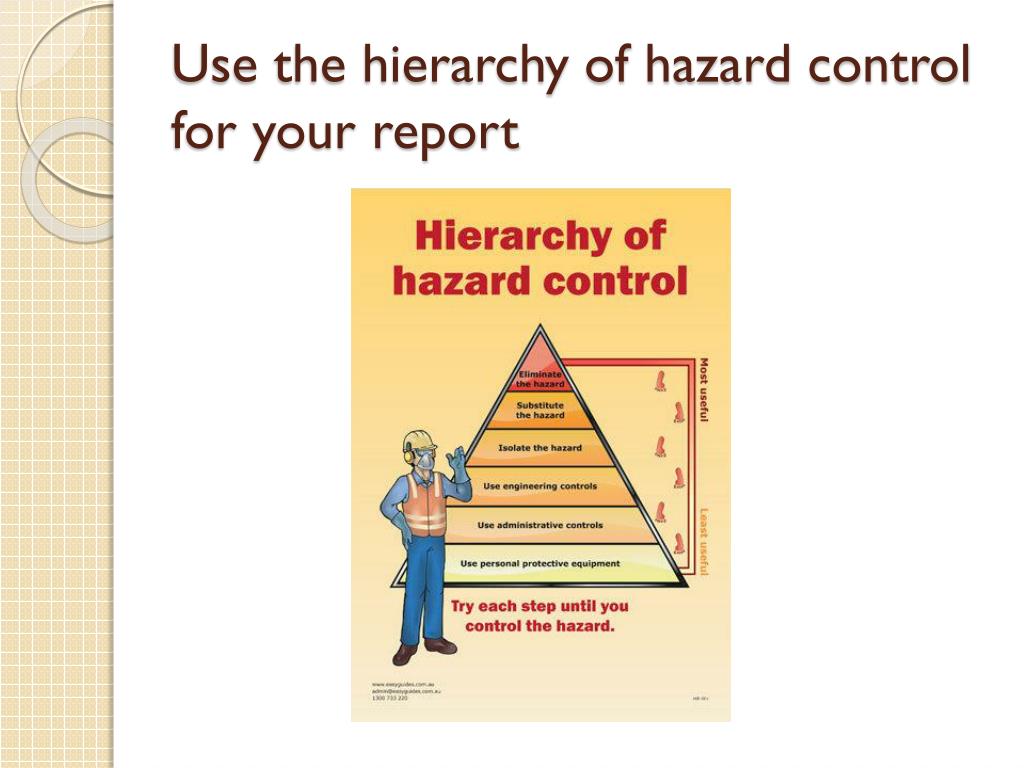 Explain hazards in terms of these: • Physical: elevated objects, noise, high voltage, mechanical injury • Chemical: hydrocarbon under pressure, toxic materials, solvents • Biological: virus, needle stick injury • Ergonomic: poor body posture, carry heavy weights, repetitive work • Psychosocial: stress or violence at the workplace
