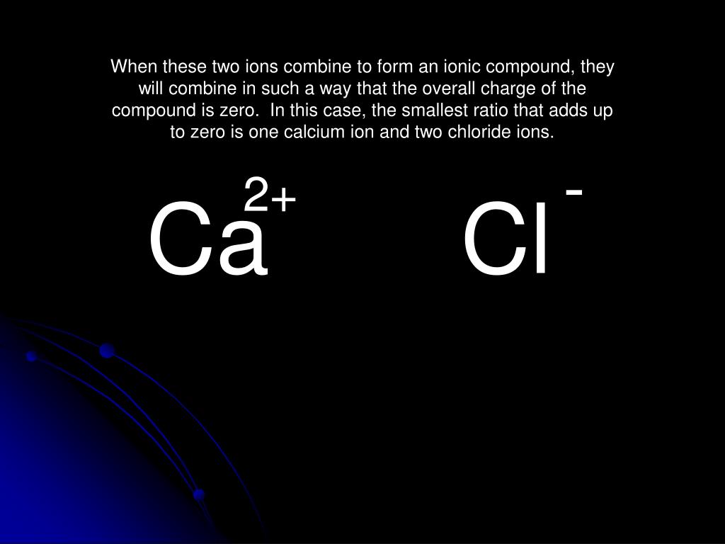 When these two ions combine to form an ionic compound, they will combine in such a way that the overall charge of the compound is zero. In this case, the smallest ratio that adds up to zero is one calcium ion and two chloride ions. - 2+ Ca Cl
