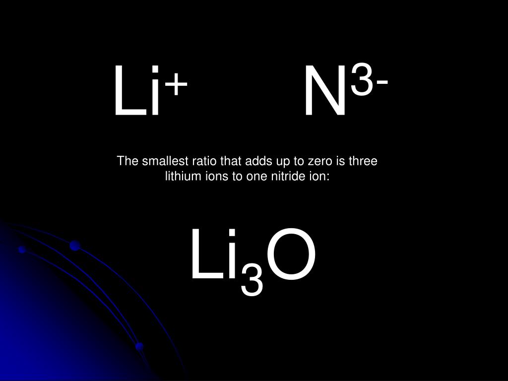 Li+ N3- The smallest ratio that adds up to zero is three lithium ions to one nitride ion: Li3O