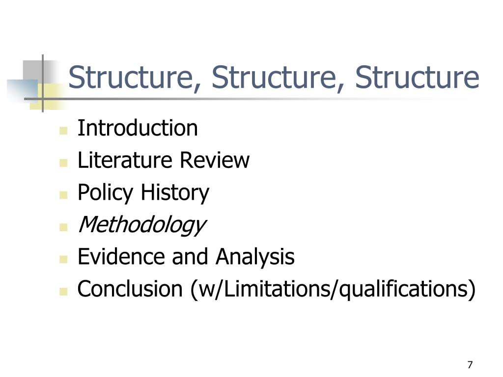 Structure, Structure, Structure • Introduction • Literature Review • Policy History • Methodology • Evidence and Analysis • Conclusion(w/Limitations/qualifications)