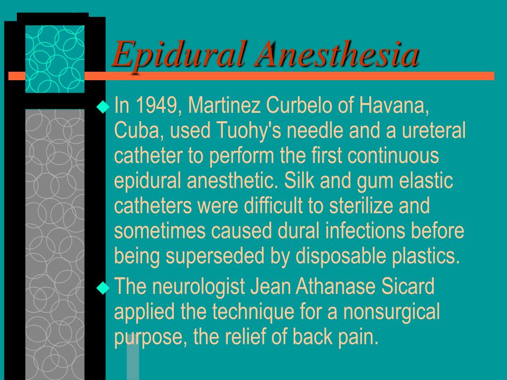 Epidural Anesthesia • In 1949, Martinez Curbelo of Havana, Cuba, used Tuohy's needle and a ureteral catheter to perform the first continuous epidural anesthetic. Silk and gum elastic catheters were difficult to sterilize and sometimes caused dural infections before being superseded by disposable plastics. • The neurologist Jean Athanase Sicard applied the technique for a nonsurgical purpose, the relief of back pain.