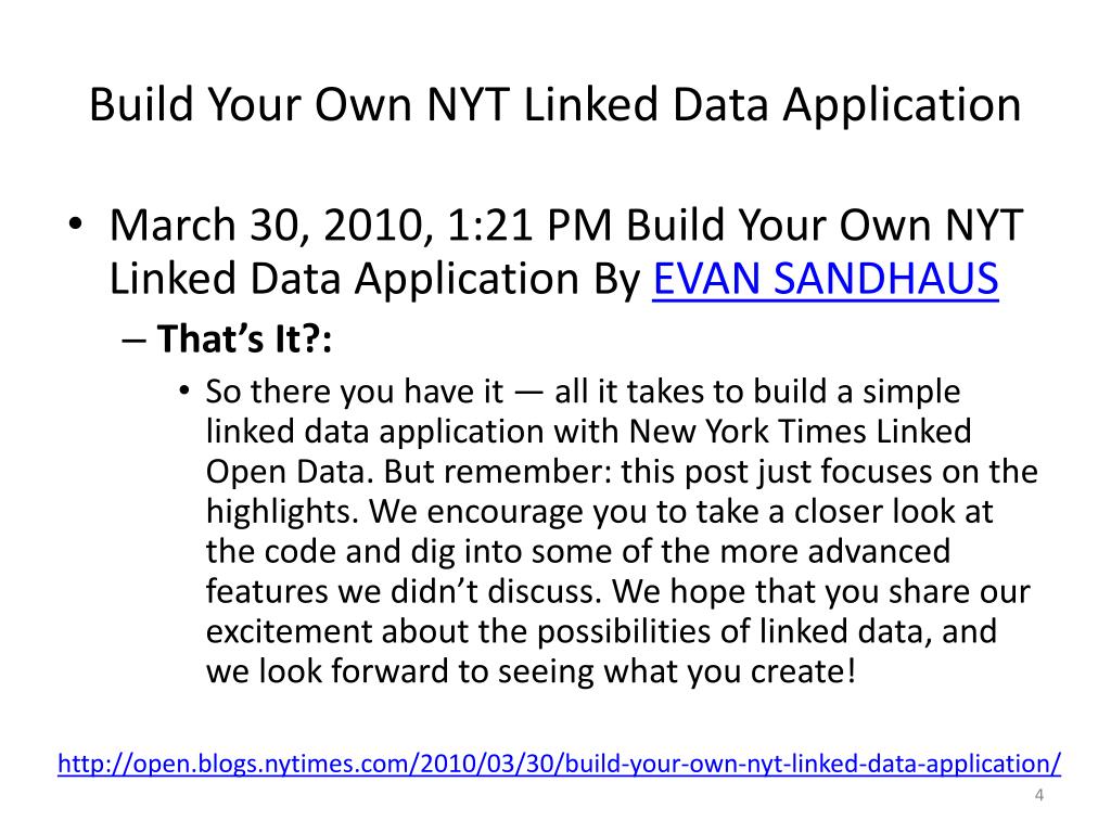 Build Your Own NYT Linked Data Application • March 30, 2010, 1:21 PM Build Your Own NYT Linked Data Application ByEVAN SANDHAUS • That’s It?: • So there you have it — all it takes to build a simple linked data application with New York Times Linked Open Data. But remember: this post just focuses on the highlights. We encourage you to take a closer look at the code and dig into some of the more advanced features we didn’t discuss. We hope that you share our excitement about the possibilities of linked data, and we look forward to seeing what you create! http://open.blogs.nytimes.com/2010/03/30/build-your-own-nyt-linked-data-application/
