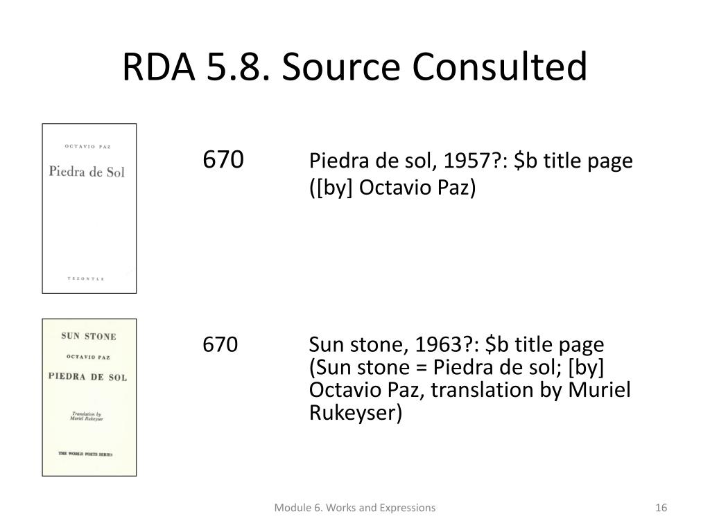 RDA 5.8. Source Consulted 670 Piedra de sol, 1957?: $b title page ([by] Octavio Paz) 670 Sun stone, 1963?: $b title page (Sun stone = Piedra de sol; [by] Octavio Paz, translation by Muriel Rukeyser) Module 6. Works and Expressions